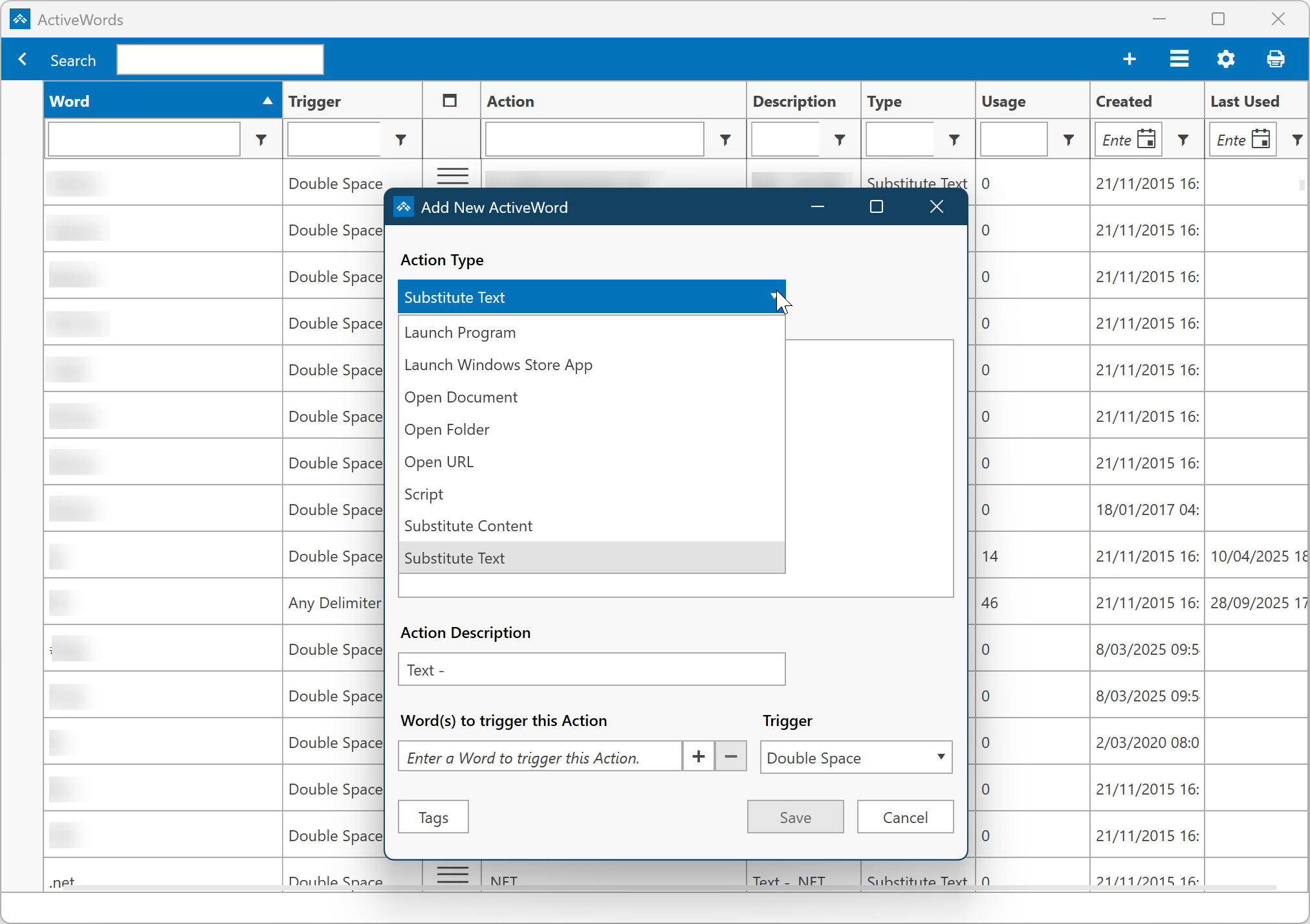 The UI for creating, sorting, finding and editing your actions has become much slicker. Tags allow you to group words, the editor allows bulk tag and word assignment and multiple trigger actions.