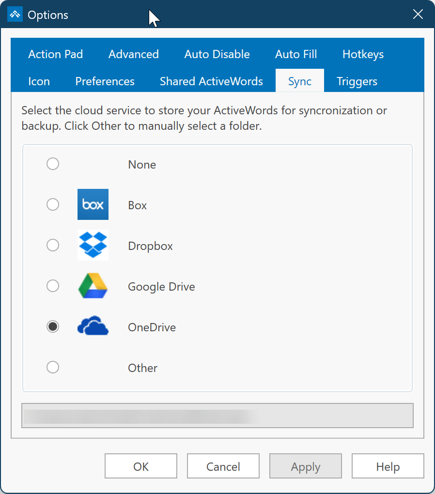 ActiveWords manages and syncs the local database on each device so edits on one device will be available on all others, next time devices are connected. Multiple cloud services are supported, and 'Other' can be set to any shared drive/folder path.