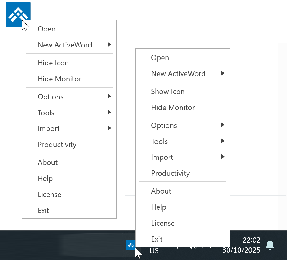 Both icon and monitor can be repositioned independently or hidden—with no loss of functionality—if desired, and that is how I use ActiveWords.