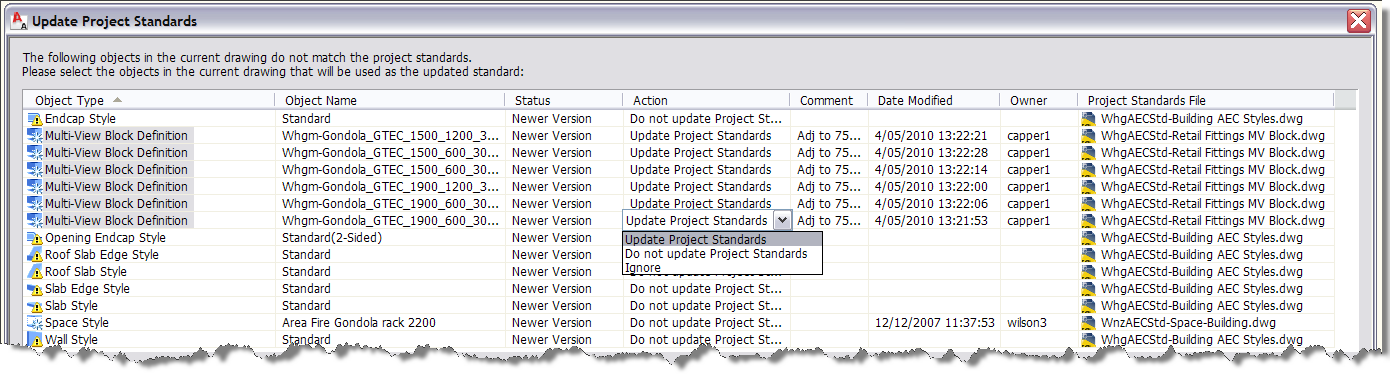 Way back in 2006 I blogged about AutoCAD Architecture/MEP’s (ACA/AMEP) Project Standards feature. It allows object and display styles to be updated in all or selected files within a Project. There is provision to automatically apply ACA/AMEP Object Styles, Display Settings, Materials and AutoCAD Standards ( like line, layer, font etc) from your reference library when you access the project. If you update content in a project it warns on project close, prompting you to optionally update the project standards for future use.