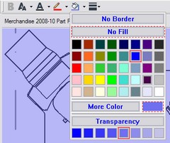 Why the ribbon is better for mark-up: ADR 2009 hid all the mark-up options in fly-out controls. This reduced the number of toolbar buttons but hugely compromised use. The ribbon exposes the controls and format tools making all the options just one click away. For example to change the colour and transparency of an item in 2009 (below left) meant;