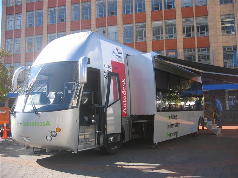 While the RV is novel NZ Reseller Salesoft CAD Solutions took Autodesk 3D design on the road back in 2006. They toured NZ in a bus (right) kitted out with an amazing array of display technology to promote the Revit BIM Platform. 3DRV meet BIM Bus!