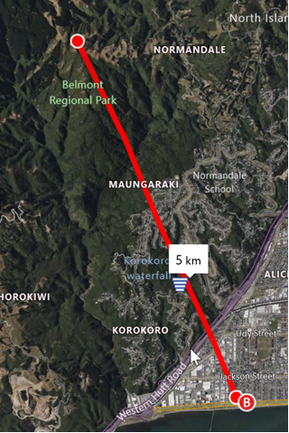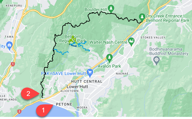 The Puke Ariki (or ‘The Place of Leaders’) Traverse (dark green line below) traverses the length of Belmont Regional Park but there are other options in there.