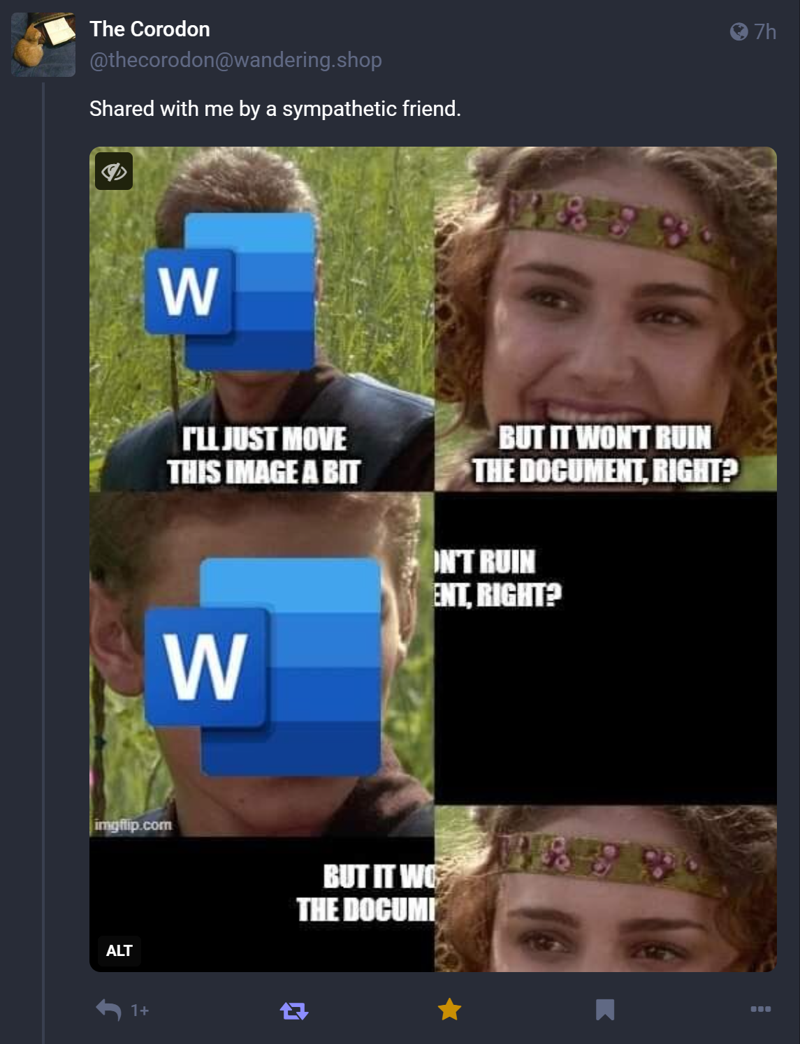 I saw this meme, on Mastodon, about the fight that is Word images.