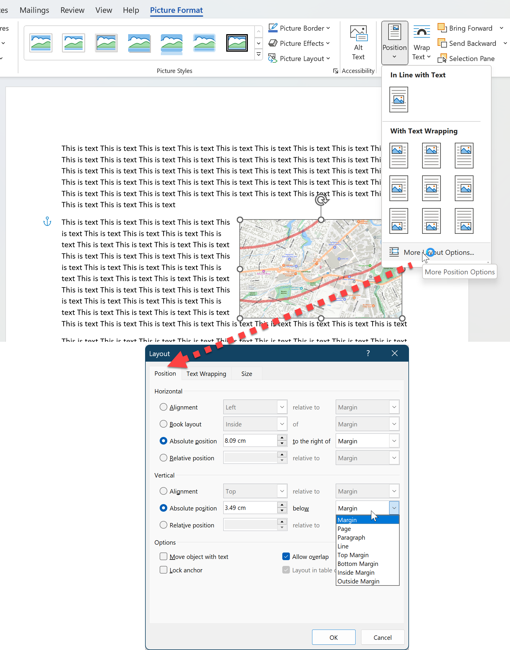 or the Ribbon Picture Format > Position > More Layout Options > Position (tab) and set the Move with Text or Lock Anchor options. You can also accurately set the X,Y position relative to margins, paragraph, line etc