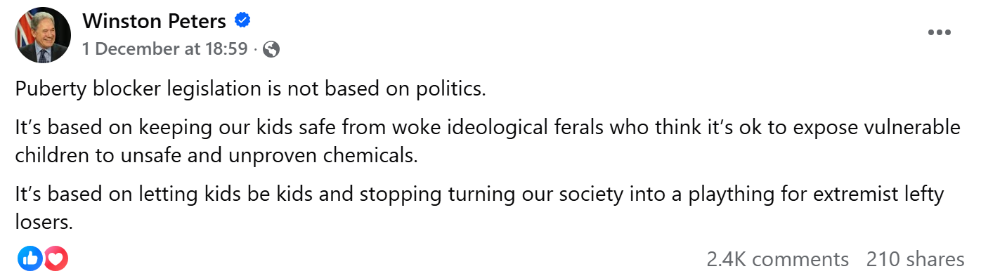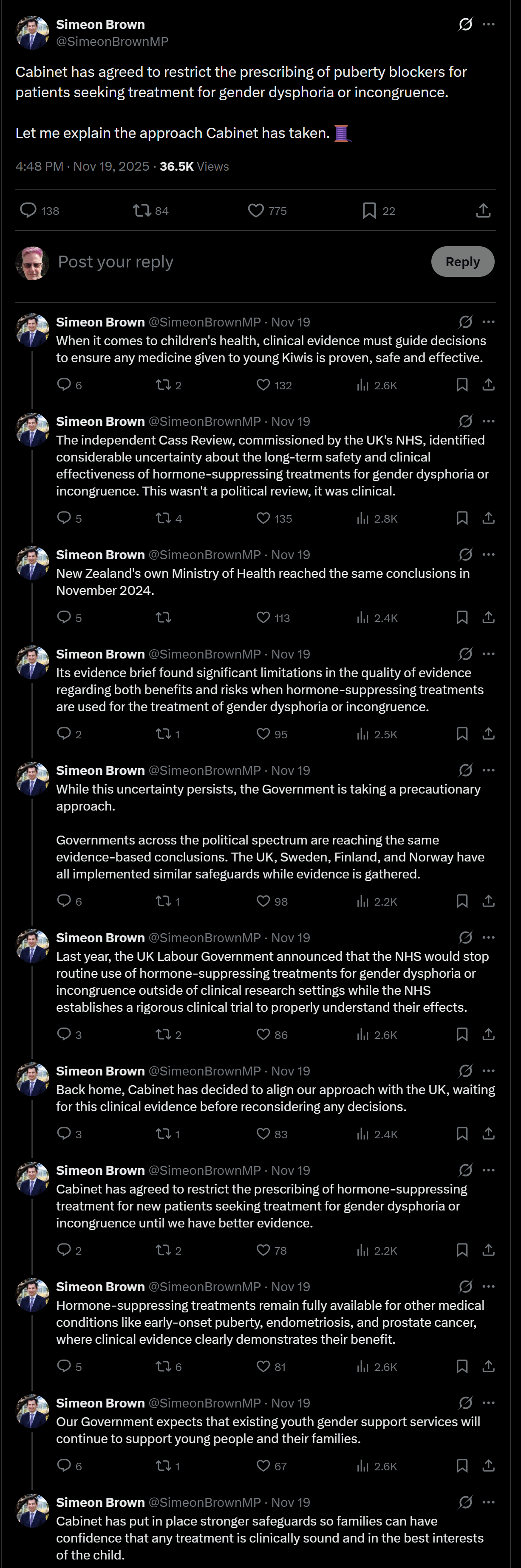 On Wednesday (19 November) NZ’s health minister Simeon Brown wrote in a statement shared on X.com [see screen capture below] that the government is taking “a precautionary approach” and cited the UK’s controversial Cass Review as justification for the ban.