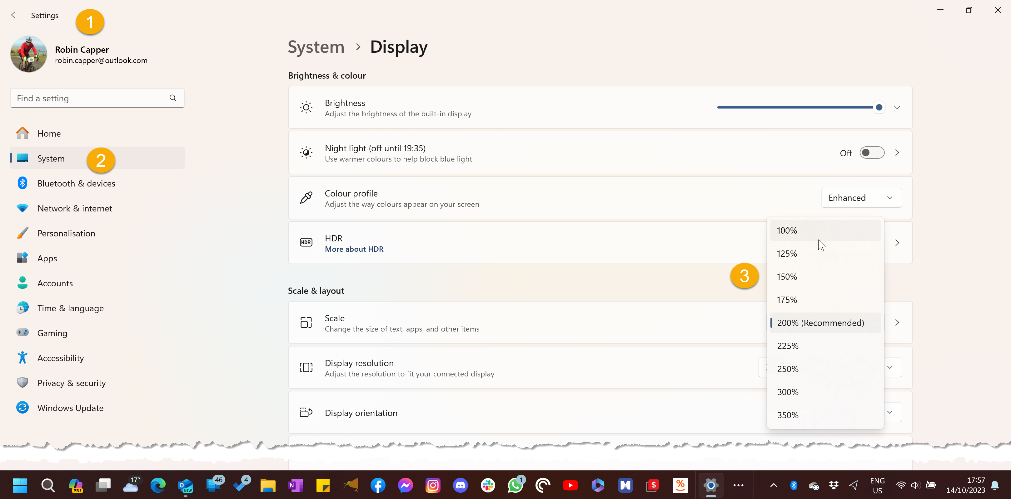 Go to Windows > Settings (1) > System (2) > Display and see if Scale (3) has some smaller than current settings on the dropdown menu.