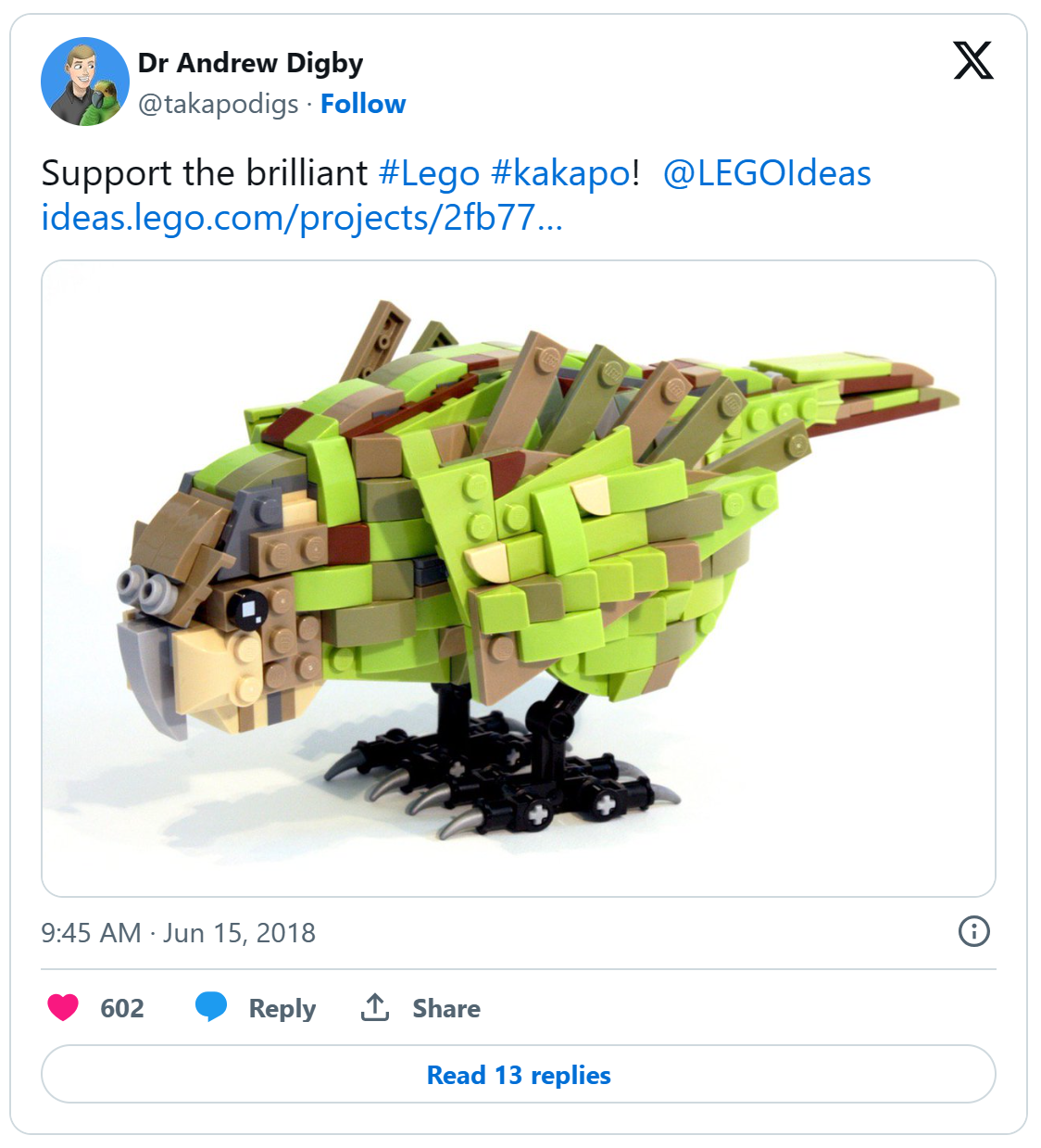 The motivation was to support an awesome Kākāpō bird project. The real Kākāpō is endangered, once considered extinct, and this LEGO tribute was promoted on Twitter by astronomer turned conservation biologist Dr Andrew Digby @takapodigs; Kākāpō and Takahē Scientist for the New Zealand Department of Conservation.