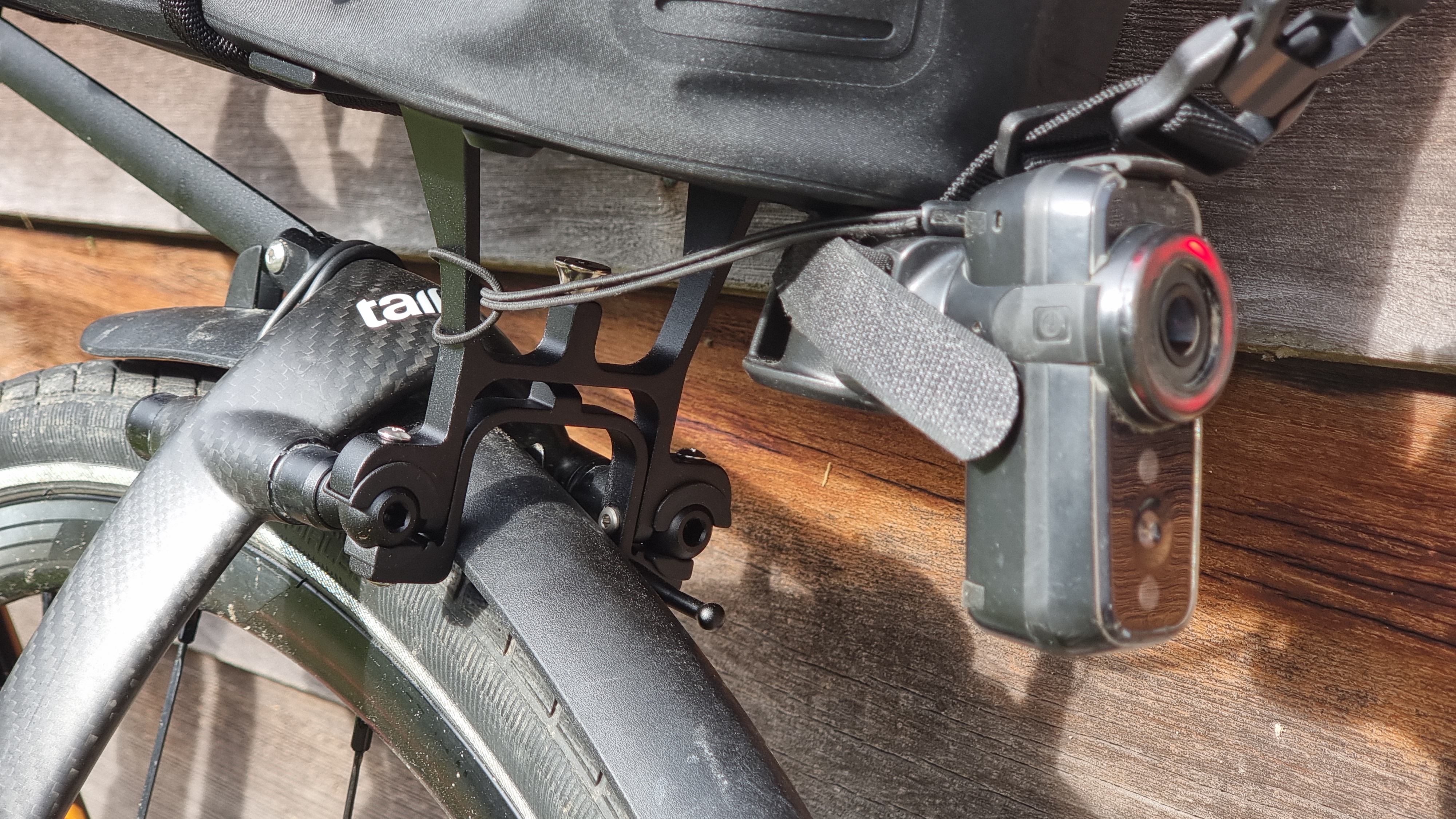 The Trunk T Connect(or) is a complex piece of beautifully manufactured engineering. Ball joints screw into the existing pannier mounts to take the bag cradle with a quick-release mechanisms to detach the bag. The little rear release cam operating lever, seen just above/behind the mudguard below, needs a 2mm Allen Key to assemble! I added their Light Mount (Seat Post Mimic) Adaptor to take my Cycliq rear light/camera.