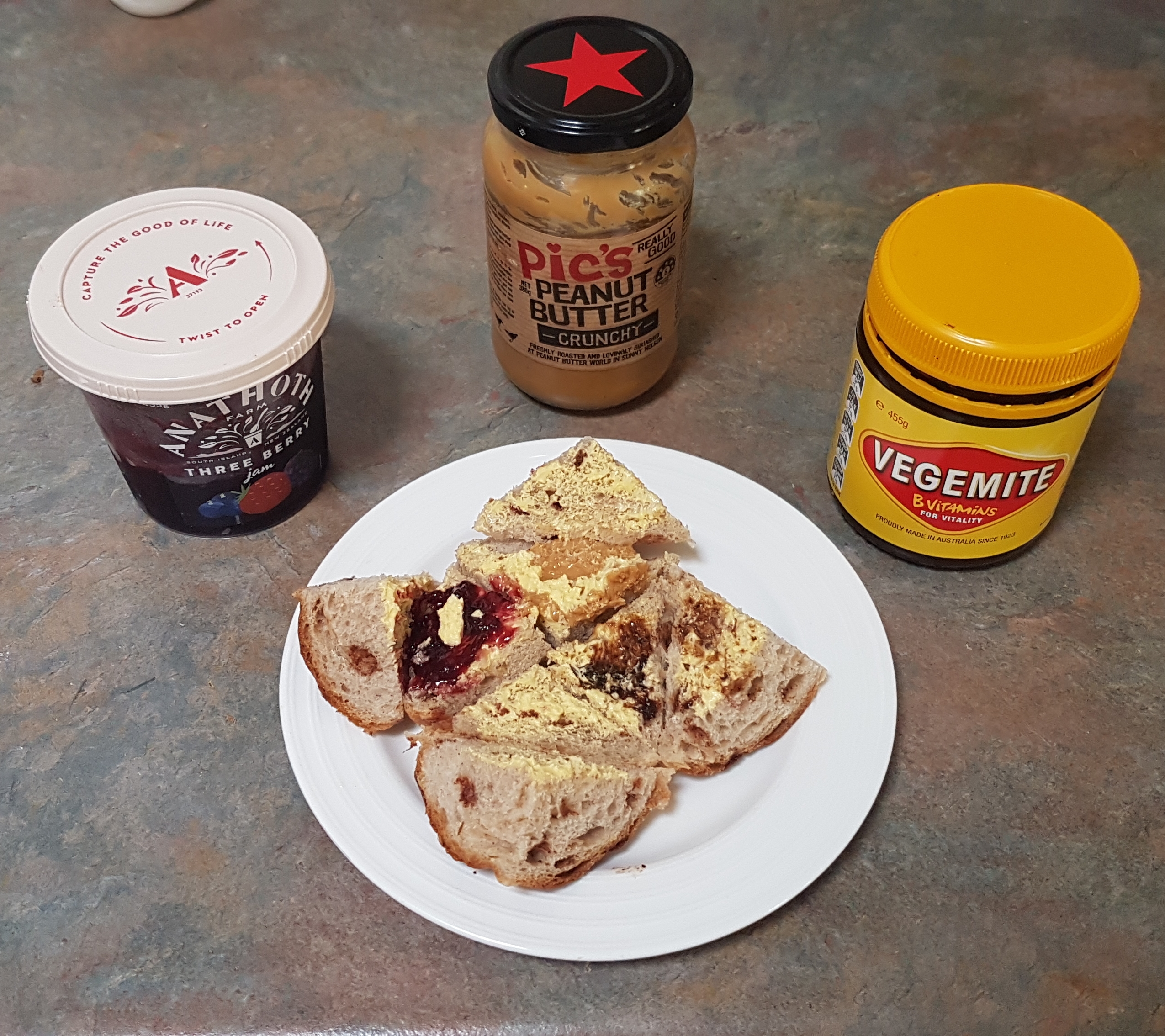 Not wanting to sacrifice (appropriate word in this context) an entire Hot Cross Bun I thought about just having half. Then looked at the other spreads in the pantry/fridge and decided to be a little more scientific: Quarters, three spreads with a base for comparison!