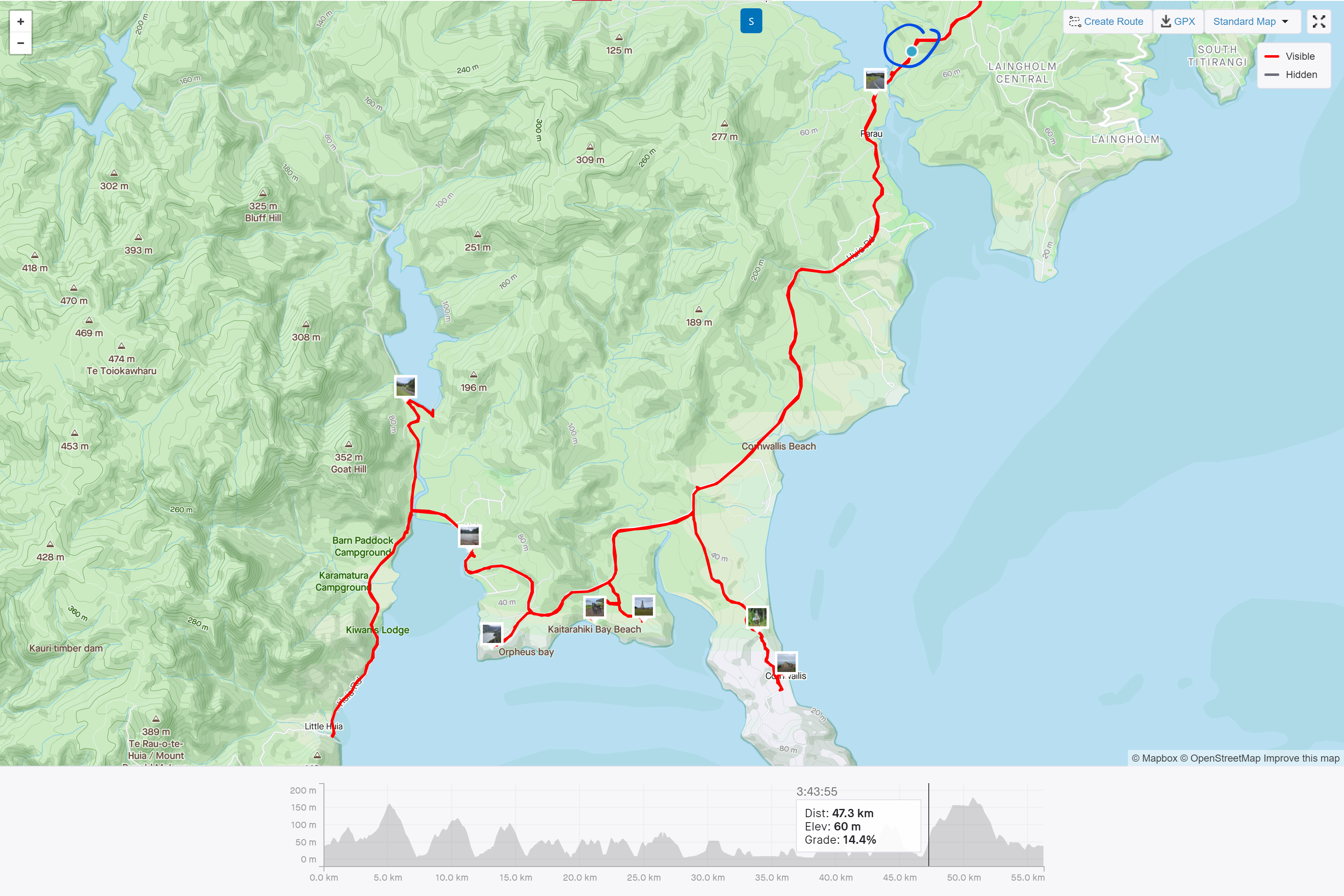 I rode out to Huia to check out a recent road closure due to slips. It's a nice ride but quite a busy road in the weekend so Monday, even school holidays, was comparatively quiet. It's also quite a lumpy ride, no huge hills but plenty of ups and downs and a sting in the return ride tail (blue circled).