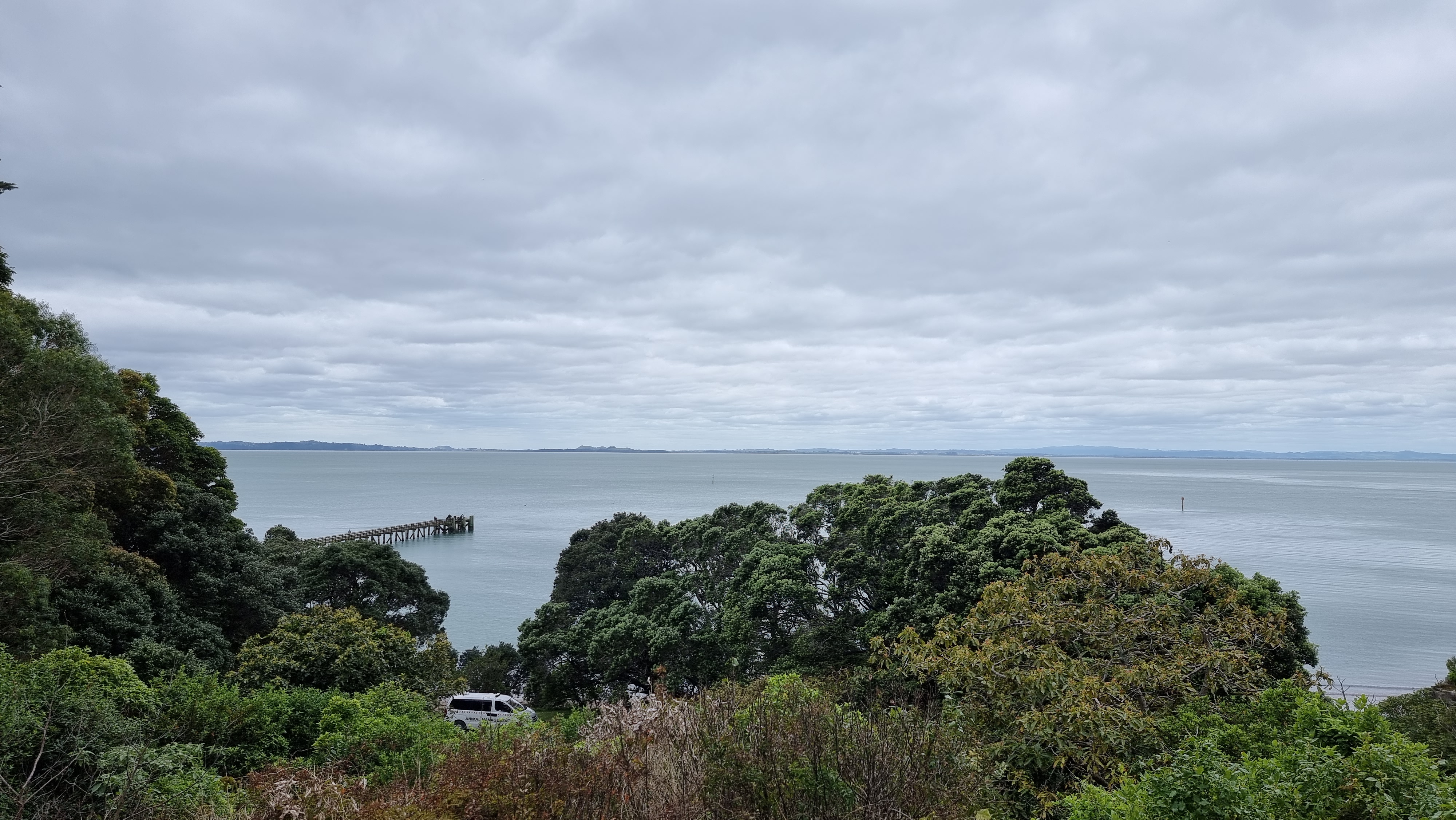 View over Kaitarakihi Bay to the Manukau Heads, a hint of a break in the overcast?