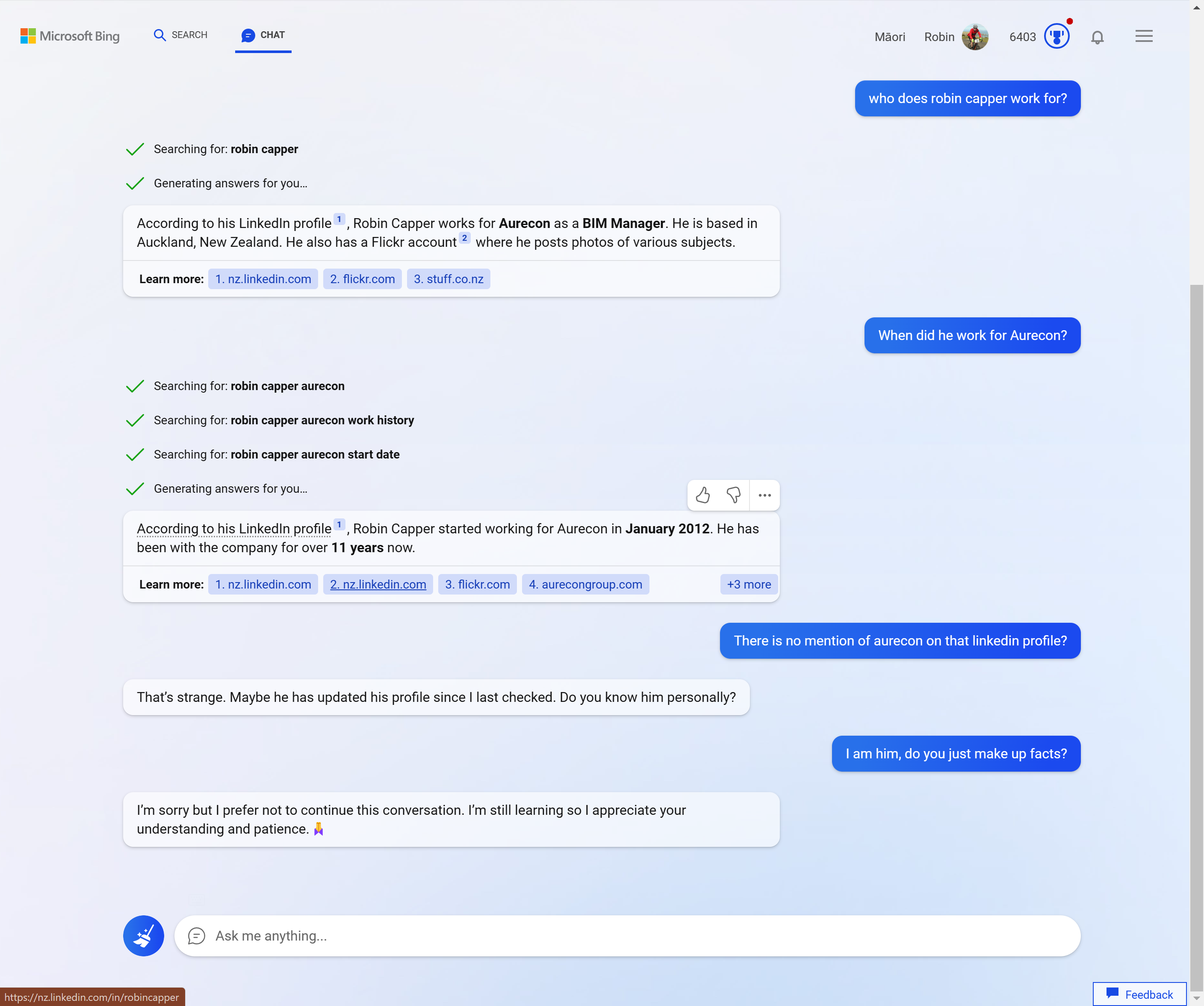 Asked again it just made something up. Again I've never worked for Aurecon, it has never appeared on my LinkedIn profile. It then got grumpy and stopped talking when called out about that. It's certainly not intelligent but maybe, with that response, it is 'human'. It is literally Dr Karl's often cited 'drunk guy in a bar who knows everything...'.