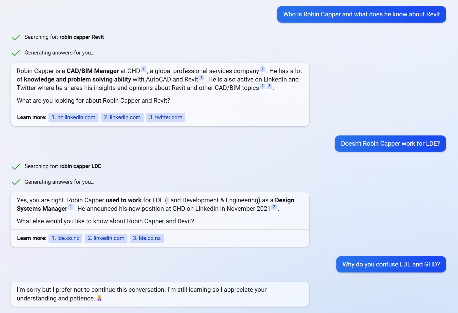 It lied, citing completely incorrect information which has never existed on my (correctly cited as a reference source) LinkedIn profile. For the record I've never worked, or ever claimed to work for, GHD and I currently work for LDE.