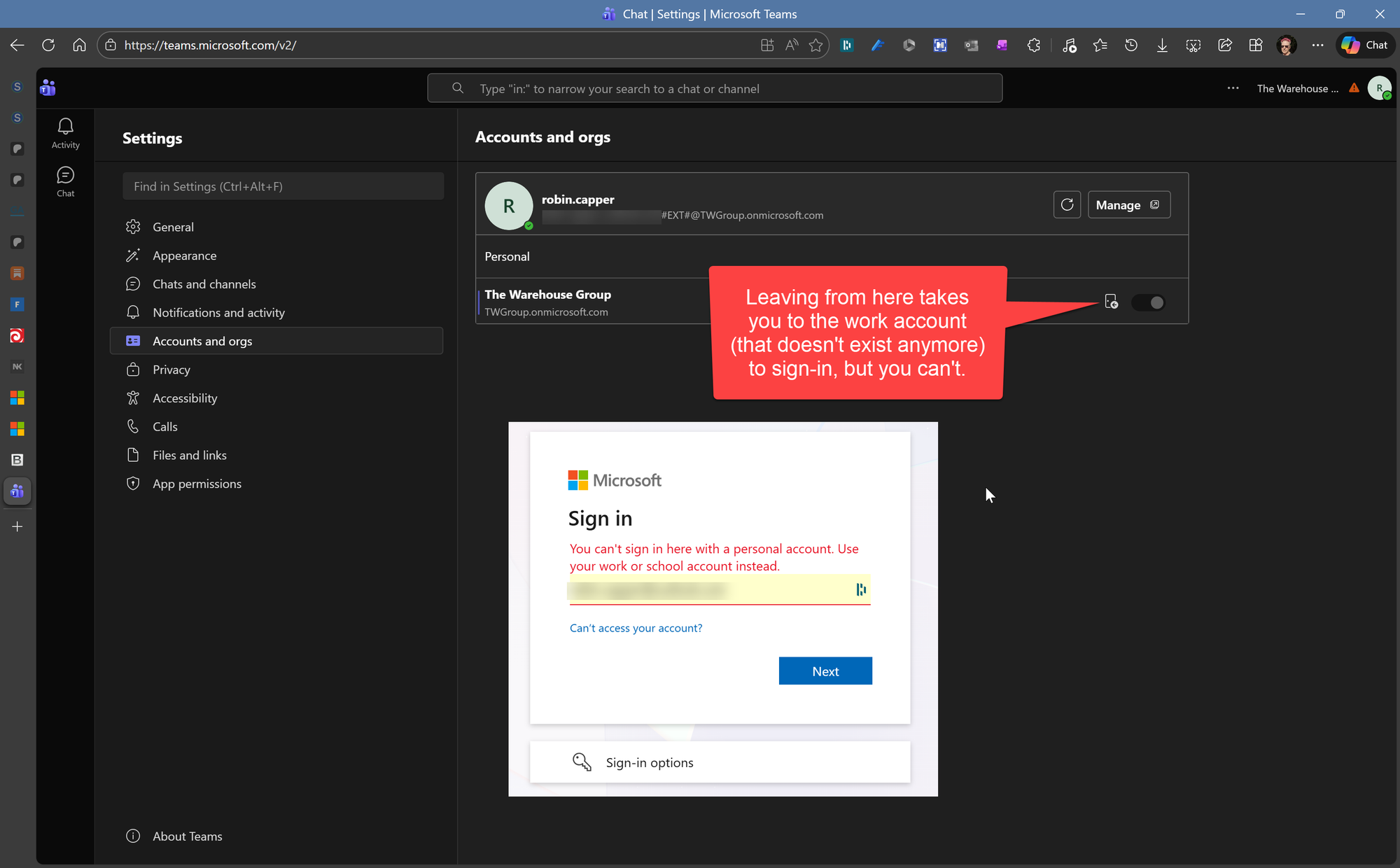 But when I signed into teams on the web the TWG (Guest) account was there but I could not 'Leave' it. Selecting Leave expected me to sign into the TWG (Guest) work account that isn't there. It was long deleted or disabled by TWG (as they should) and I could not sign in there with a personal account.