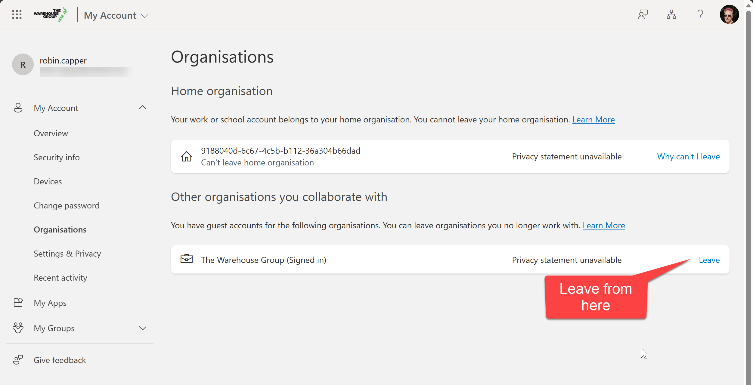 - Click on Leave Organization next to the one that's listed as Guest in Teams.