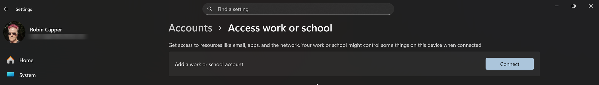 There is no TWG work or school account to delete in Windows: