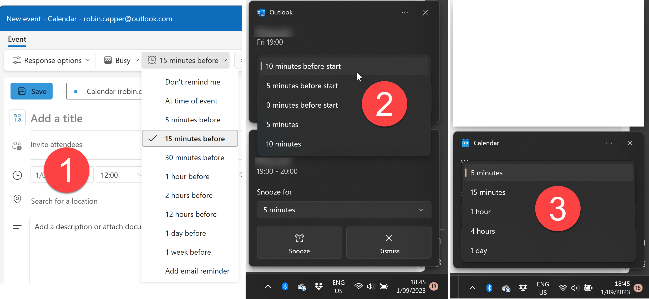 Take, for instance, snooze times on a task reminder, you can set a great range of options on a New Calendar Item (1), but at the time Snooze offers +- 5 or 10 minutes (2), or just 5 or 10 minutes, and that's it. What's worse, I found this in draft, first written in September 2023 and it's no better today.