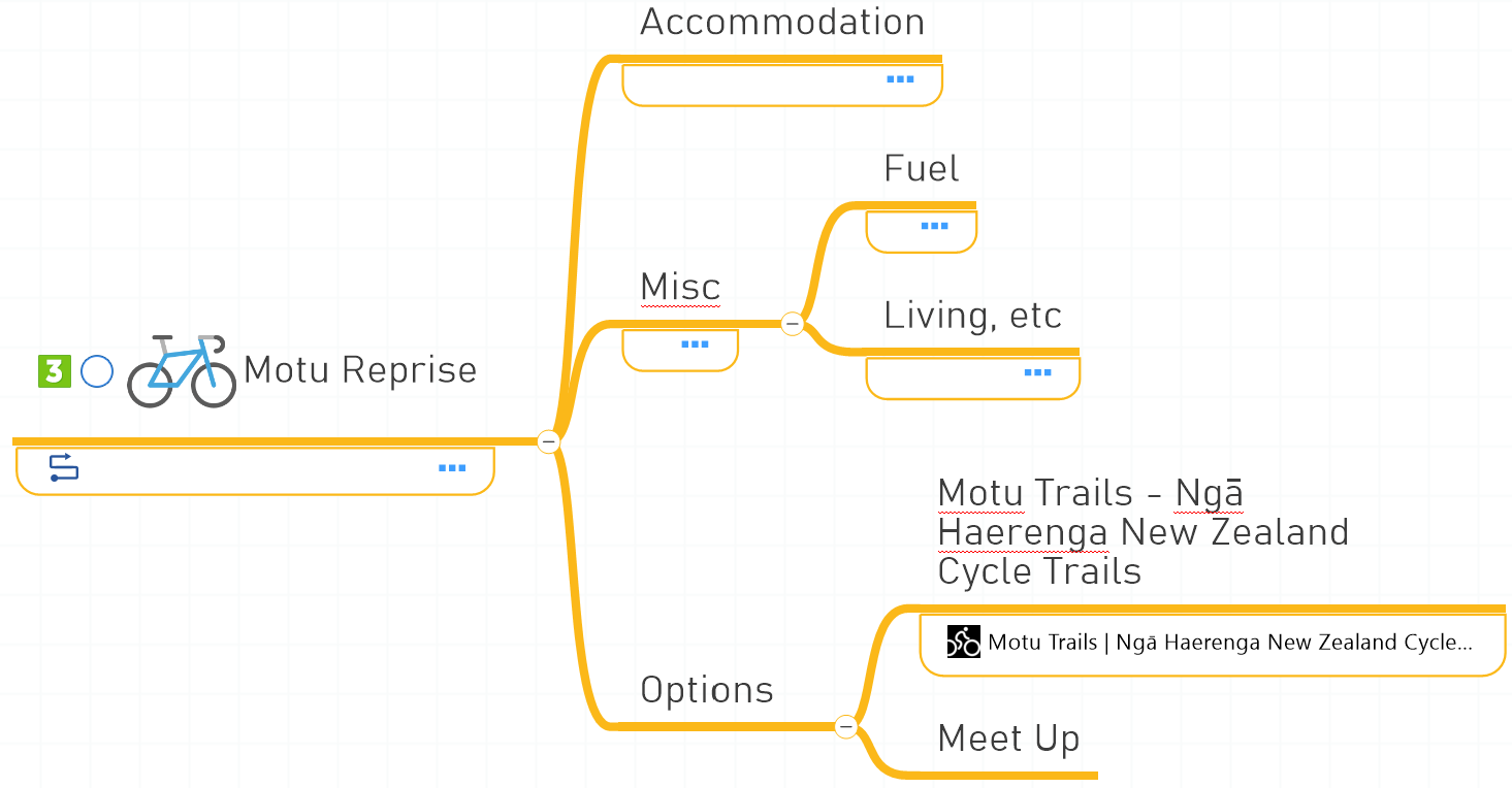 Keep adding topics and soon you end up with an itinerary map, also viewable/editable as a more document formatted outline.