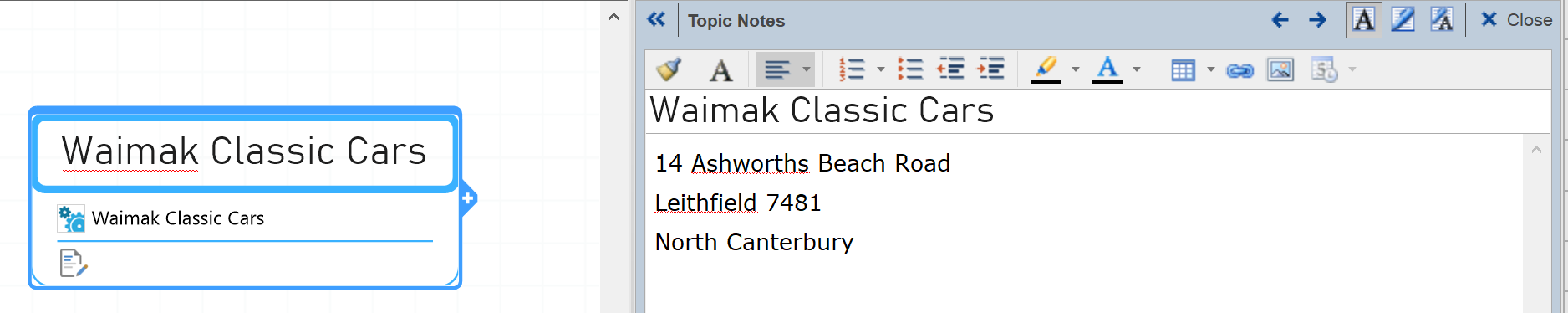 Topic notes, signified by a note icon, can hold any formatted paragraph text and images.