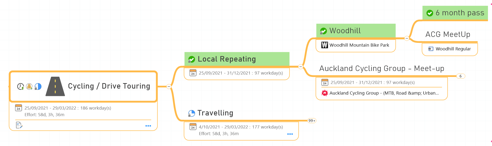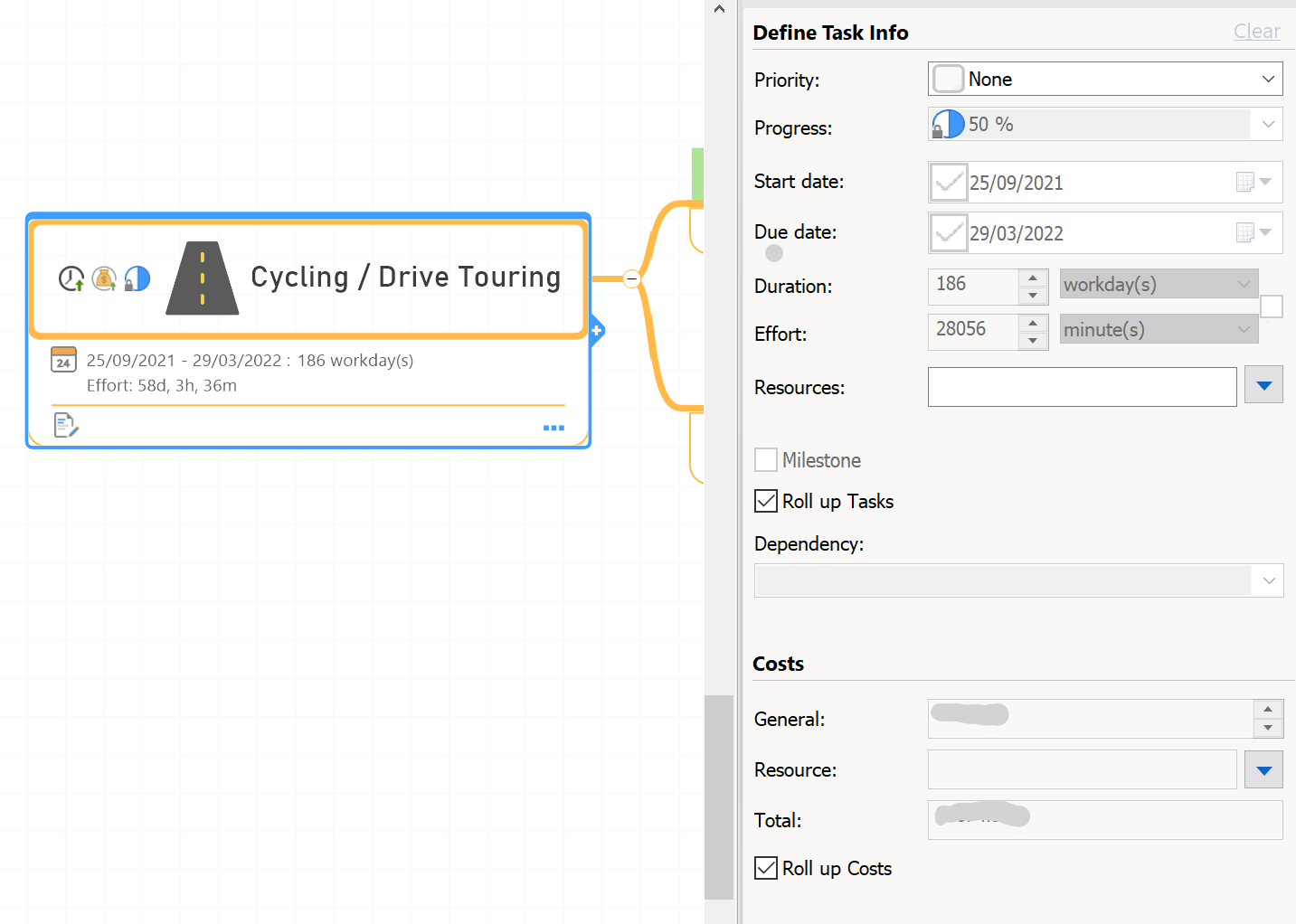 Those discrete little ticks to 'Roll up Tasks' and 'Roll up Costs' are the key. Any Task/cost property applied to a sub-topic is reflected in all topics in the branch above it. in the topic below you can see % Complete being rolled up, from '6 Month Pass' to the top level with completed tasks/branches automatically turning green.
