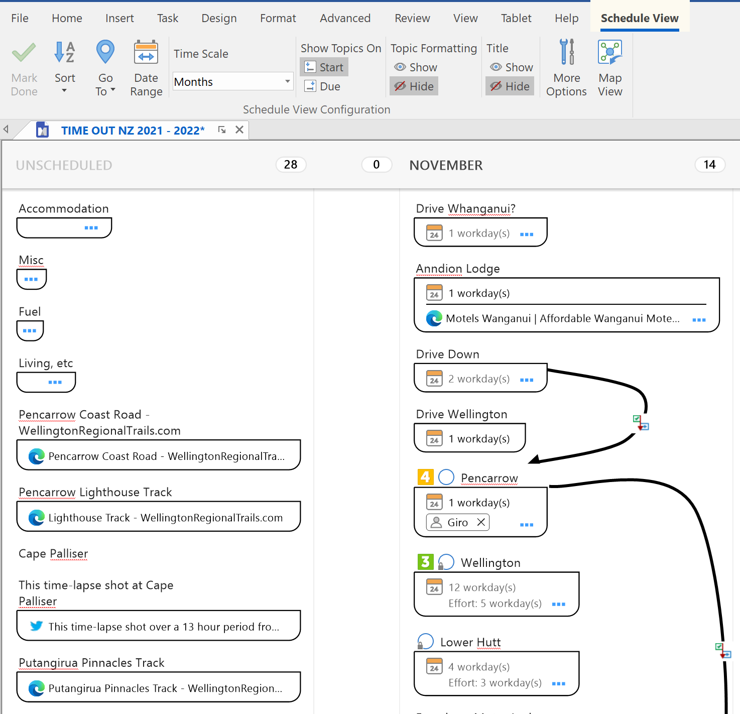 Schedule View gives a time (Year, Month, Week, Day) sorted view with drag and drop, great for 'high level' drag and drop arrangement of tasks by time. Below I was looking at visiting the Wellington region to tie in with a fixed event date. Dragging a task into the column assigns it to the first increment of the period, 1 November in the month view, and then you can refine further.