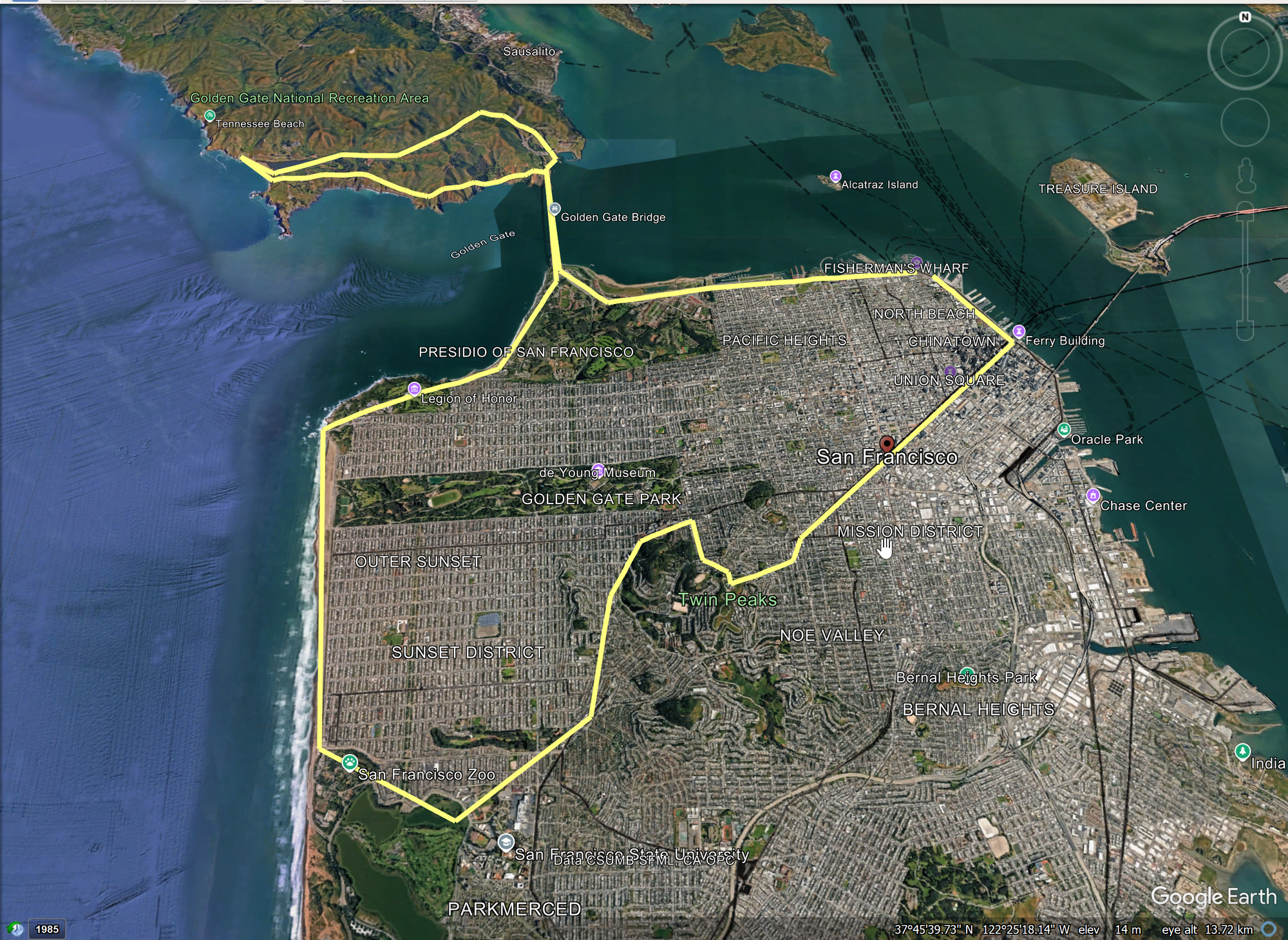 This ride pre-dated any use of ride tracking but the loop—starting from a bike rental near Fisherman's Wharf—was approximately this...