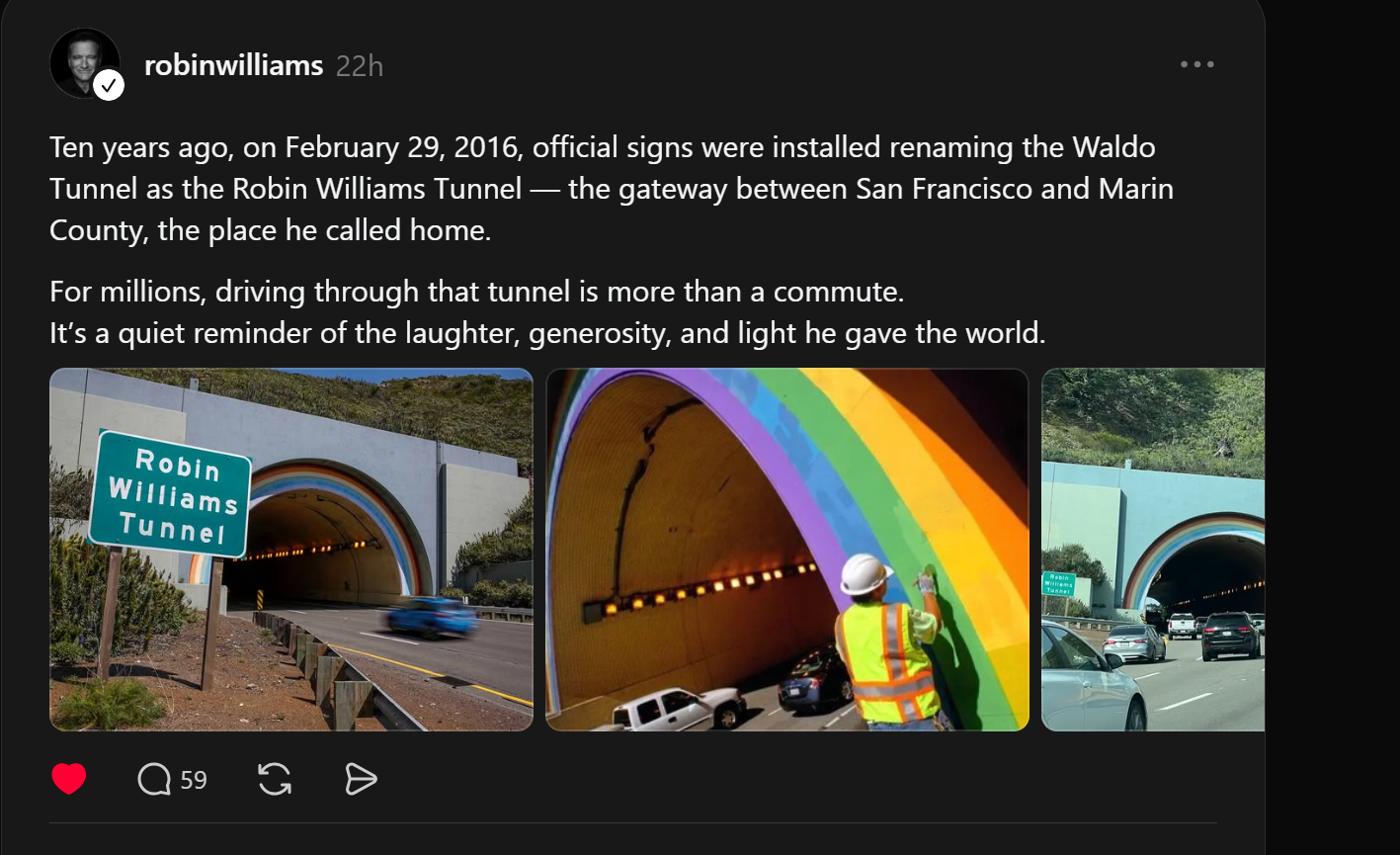 There is a scene in the biopic 'Robin Williams: Come inside my mind' which shows him cycling down the hill from the Marin Headland Golden Gate lookout toward Rodeo Beach (in my photo above) with this quote from Eric Idle: