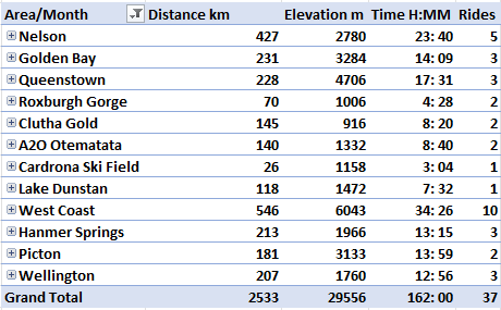 Since leaving Auckland I've done 37 rides totalling ~2,500km! About 1,600km was on En-Trance (Mtb), ~770km on Giro (Gravel bike) and 170km on the rented bike at Roxburgh. Tomorrow, I head home, for whatever is next.