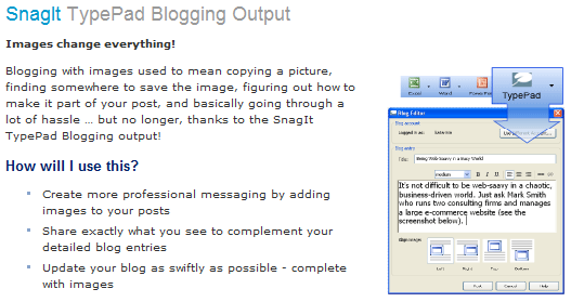 This is brilliant, from SnagIt to TypePad in a click! Versions for WordPress, Live Journal, Movable Type and TypePad at: http://www.techsmith.com/snagit/accessories/blogging.asp via blognation