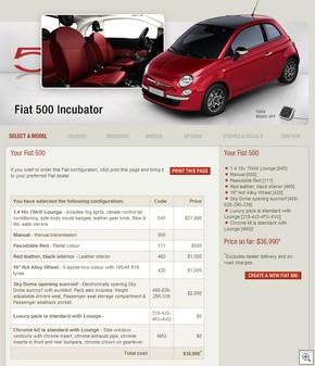 As you build your Fiat 500 your choices will be displayed along with the cost of the car….1.4 16v 75kW Lounge Manual Pasodoble Red Red leather, black interior 16" Hot Alloy Wheel Sky Dome opening sunroof Luxury pack is standard with Lounge Chrome kit is standard with Lounge Price so far: $36,990