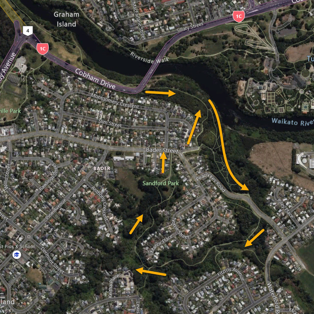 Sandford Park is where you go if carry on past the Cobham Drive (SH1C) Bridge...