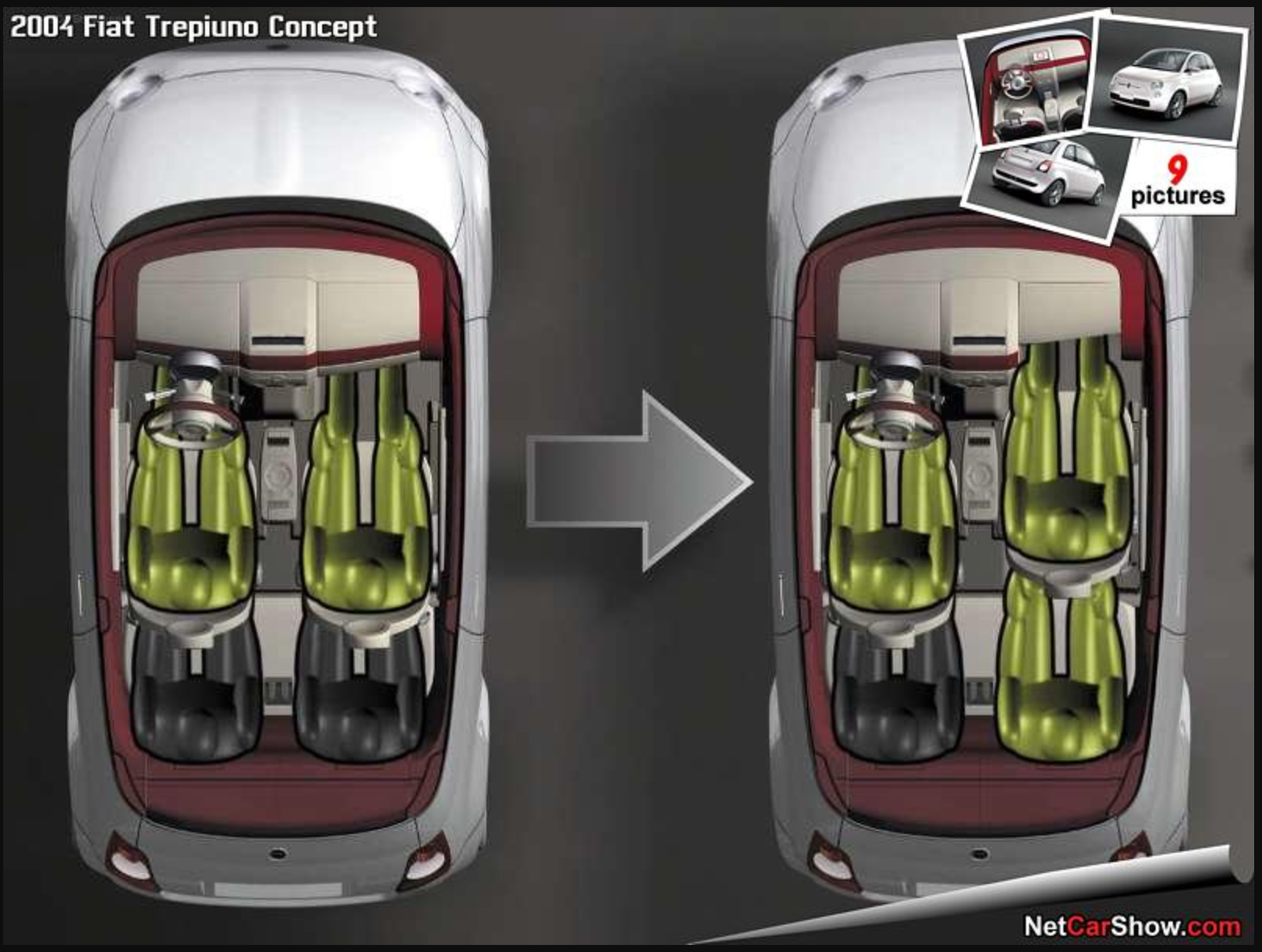 While Frank Stephenson did design the production new generation Fiat 500 it is a pity he did not mention, credit, Roberto Giollito and his Fiat Trepiùno concept car (below) which served as the inspiration. It was named for a unique 1+2 seat configuration where the front passenger seat could be slid forward, under a recessed dashboard, to create two full size passenger spaces beside the driver. Pity that didn't make production!