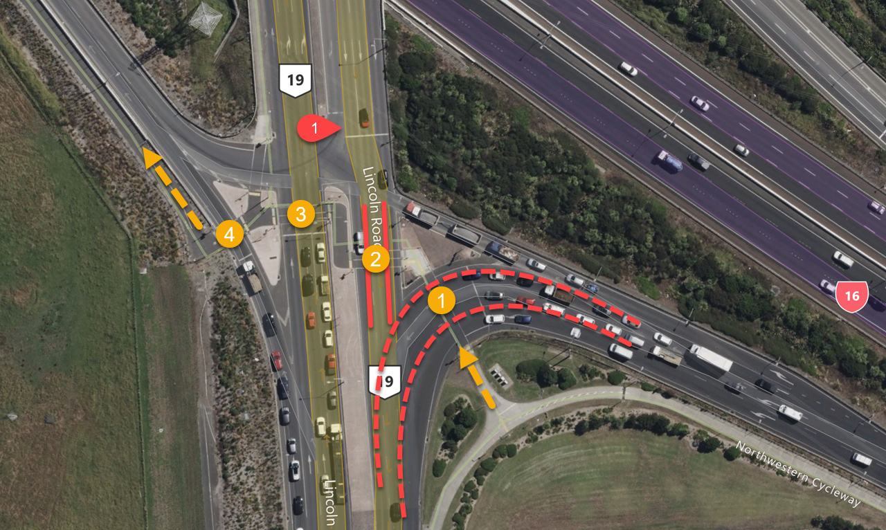 The SH16 North-western Cyclepath is great, but cheapskate decisions mean several road crossings along it are terrible. Among the worst is this four-crossing mess at Lincoln Road, when poor signal design allows uncontrolled backed up traffic to legally drive over the 'Green Crossing'. When the path crossing turns green there is no sign of it visible to the cars who've already passed the signals that controls this intersection.